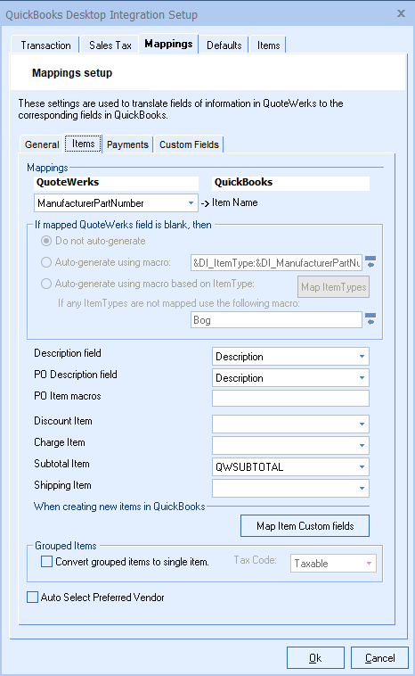 1.In the QuoteWerks QuickBooks Integration Setup window, on the Mappings -> Items tab, under the Subtotal item mapping, make sure that you have mapped an existing QuickBooks Item Name that is a QuickBooks Subtotal Item type.