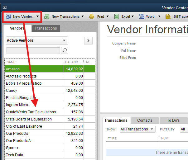 2.In QuickBooks Desktop, under Vendors->Vendor Center menu, create a vendor named "QuoteWerks Tax Calculations"