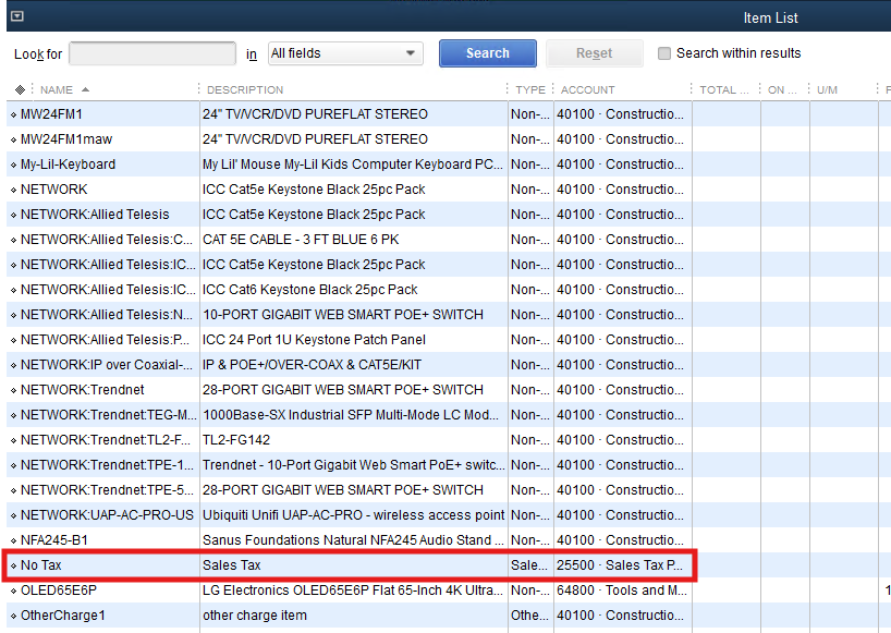 4.In QuickBooks Desktop, under Lists->Item List, make sure a Sales Tax Item named "No Tax" exists.