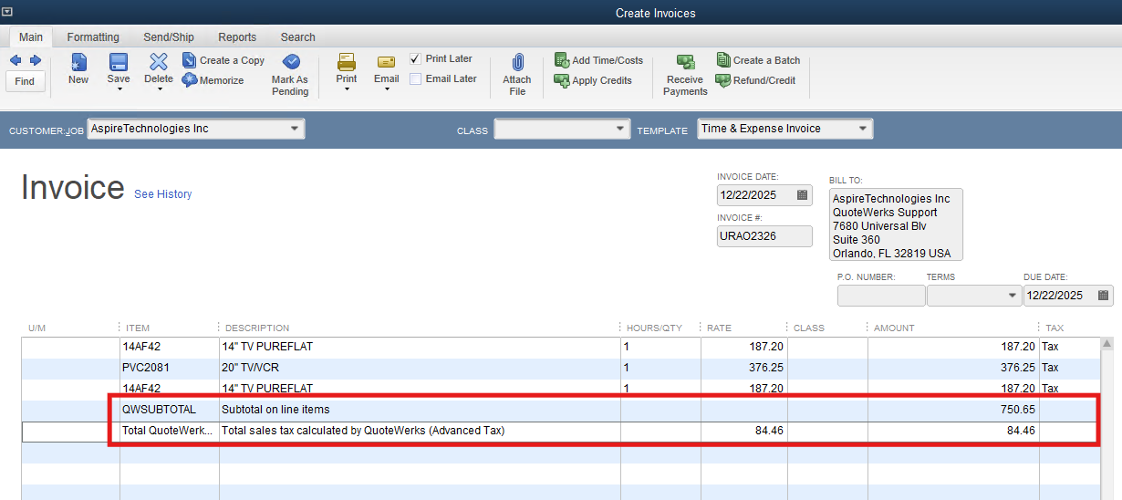 The QuoteWerks approach is the same as Avalara AvaTax and others which is to export to invoice to QuickBooks from QuoteWerks and in the process set the invoice level tax item to "No Tax", and append to the end of the line items, a QuickBooks Subtotal line item and a special "Total QuoteWerks Tax" line below it with the advanced sales tax amount that was calculated in QuoteWerks (see below.)