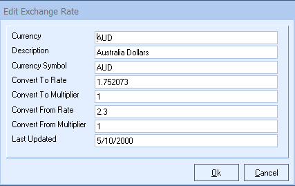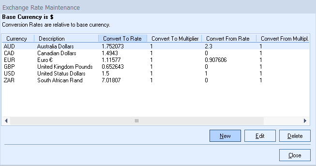button next to the Alternate Currency field (or, as explained previously, select the Utilities -> Exchange Rate Maintenance... menu). This will display the Exchange Rate Maintenance window: