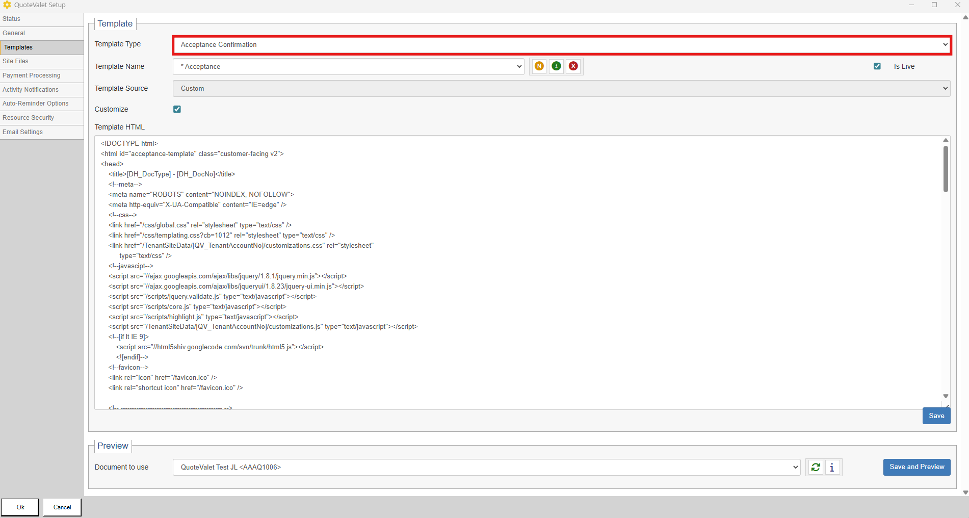 1. Navigate to Tools -> Options -> QuoteValet -> QuoteValet Setup -> Templates. Your default Customer Facing template will appear. Switch the Tempate Type to ' Acceptance Confirmation.' Check the Customize checkbox. When you click the Customize checkbox, a pop-up will appear to confirm if you would like to edit the template. Ensure this is the correct template that you would like to customize. If so, click yes.