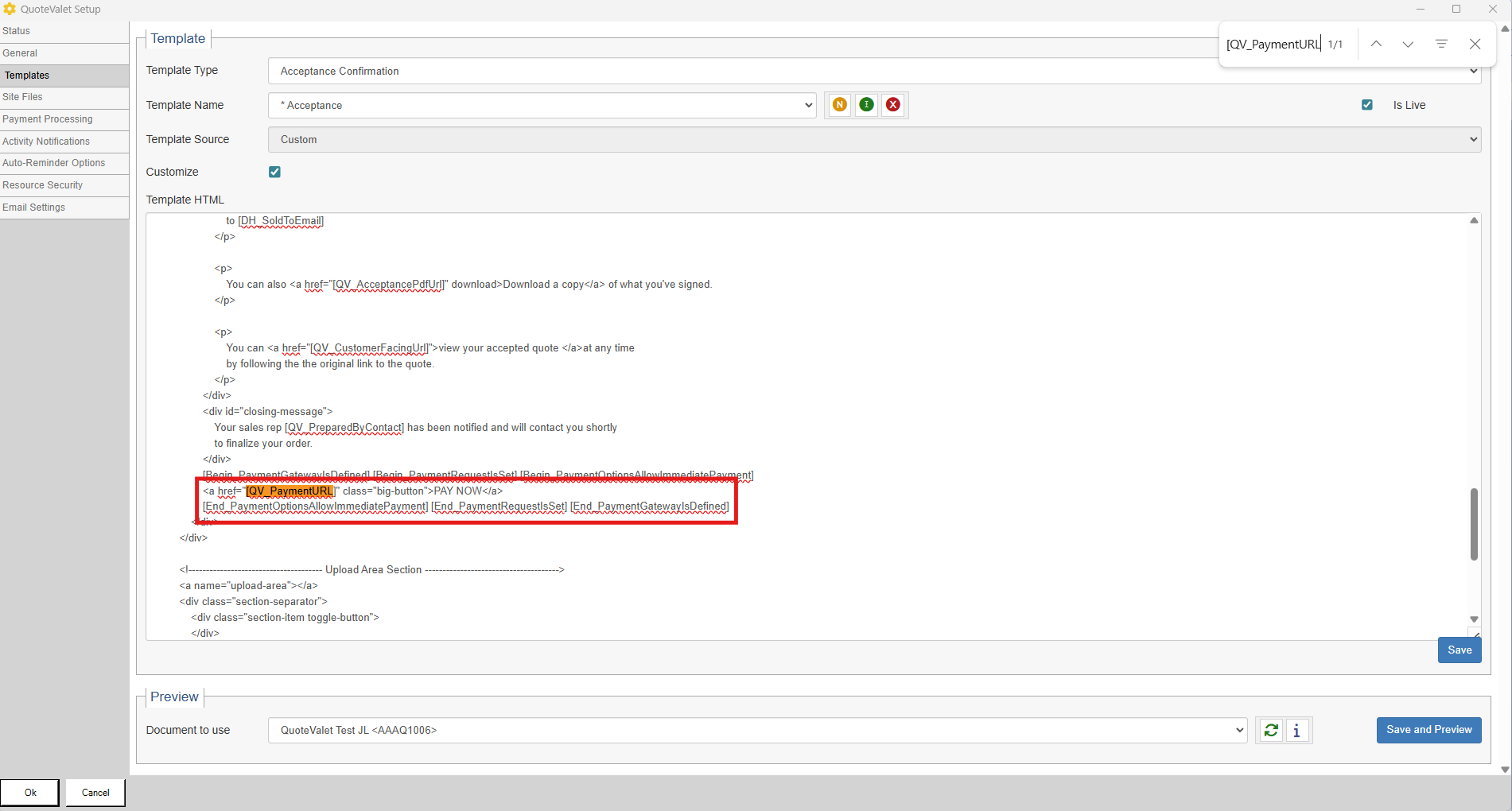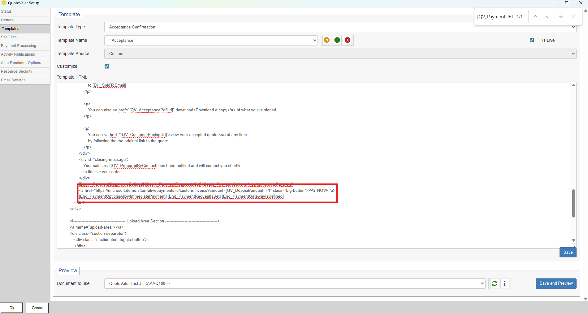 3. Replace "[QV_PaymentURL]" with the billing link below. This billing link includes a QuoteWerks variable, [QV_DepositAmount:f=1], for the deposit amount. If you would like to use a different variable, you can replace it with your desired option. Click "Save and Preview" to preview the payment button that will appear to customers once they accept the quote.