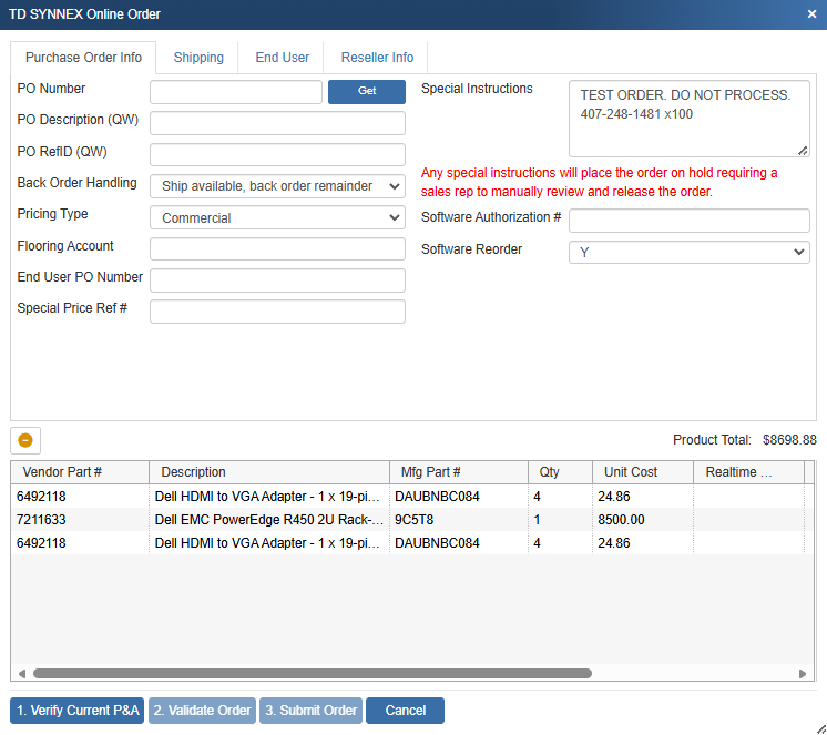 The Special Instructions field holds up to 300 characters. By using the Special Instructions field, users can choose to submit online orders to TD SYNNEX overriding the TD SYNNEX real-time price with your own TD SYNNEX sales rep negotiated price. When submitting an overridden price you can enter a reason such as a TD SYNNEX quotation # in the Special Instructions field. Upon receipt of an order where prices don’t match the TD SYNNEX real-time pricing, the TD SYNNEX order is automatically flagged and the TD SYNNEX sales rep will review the order manually.