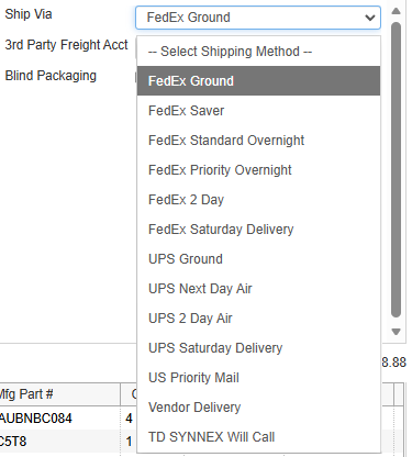 Here you can select your preferred shipping carrier. The available options will vary depending on your country and are defined by TD SYNNEX.