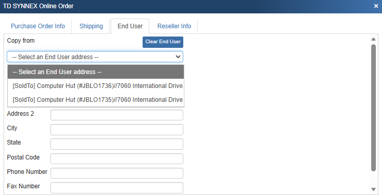 This tab provides fields to supply End User contact details for the order. These are typically only necessary in situations where the product being ordered is a software license or warranty that requires the End User’s details.
