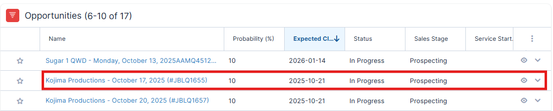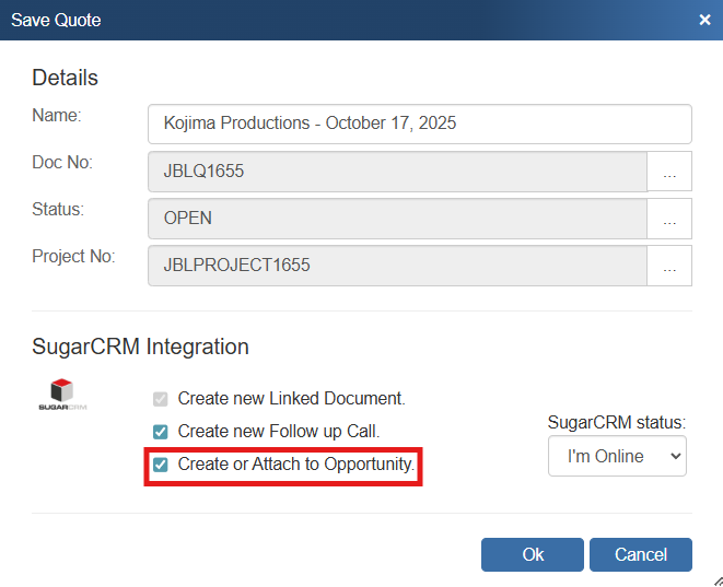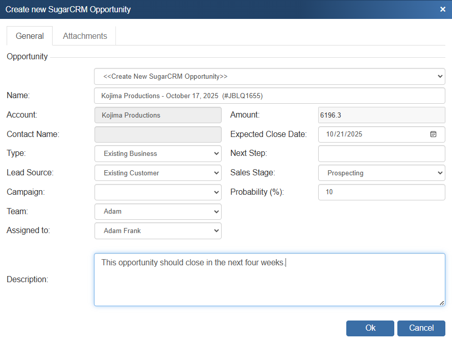 Once you click [Ok], this option will create or update a SugarCRM opportunity or attach to an existing opportunity in SugarCRM under the Opportunities heading.