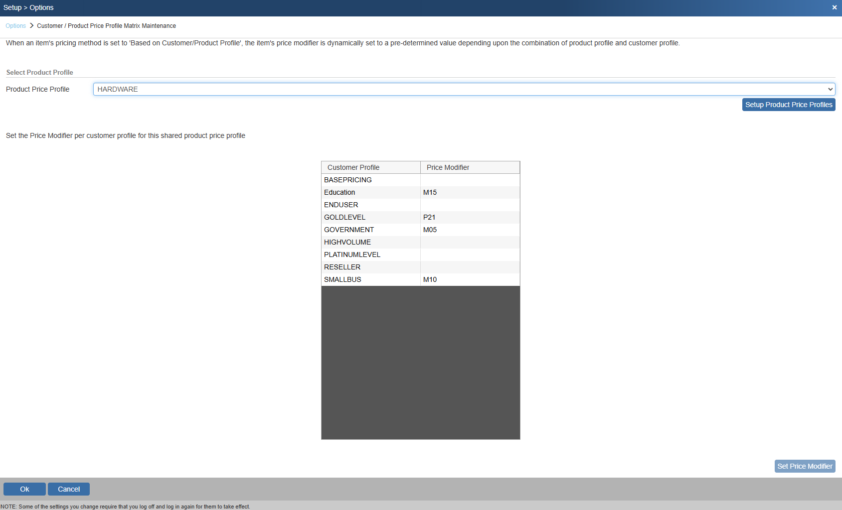 Navigate to Setup -> Options -> Customer/Product Price Profile Matrix to set the Price Modifier per Customer Profile for the Product Profile. More details on this pricing method can be found in Item Pricing Methods.