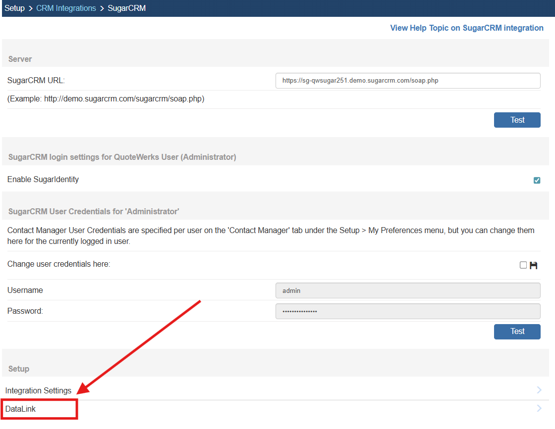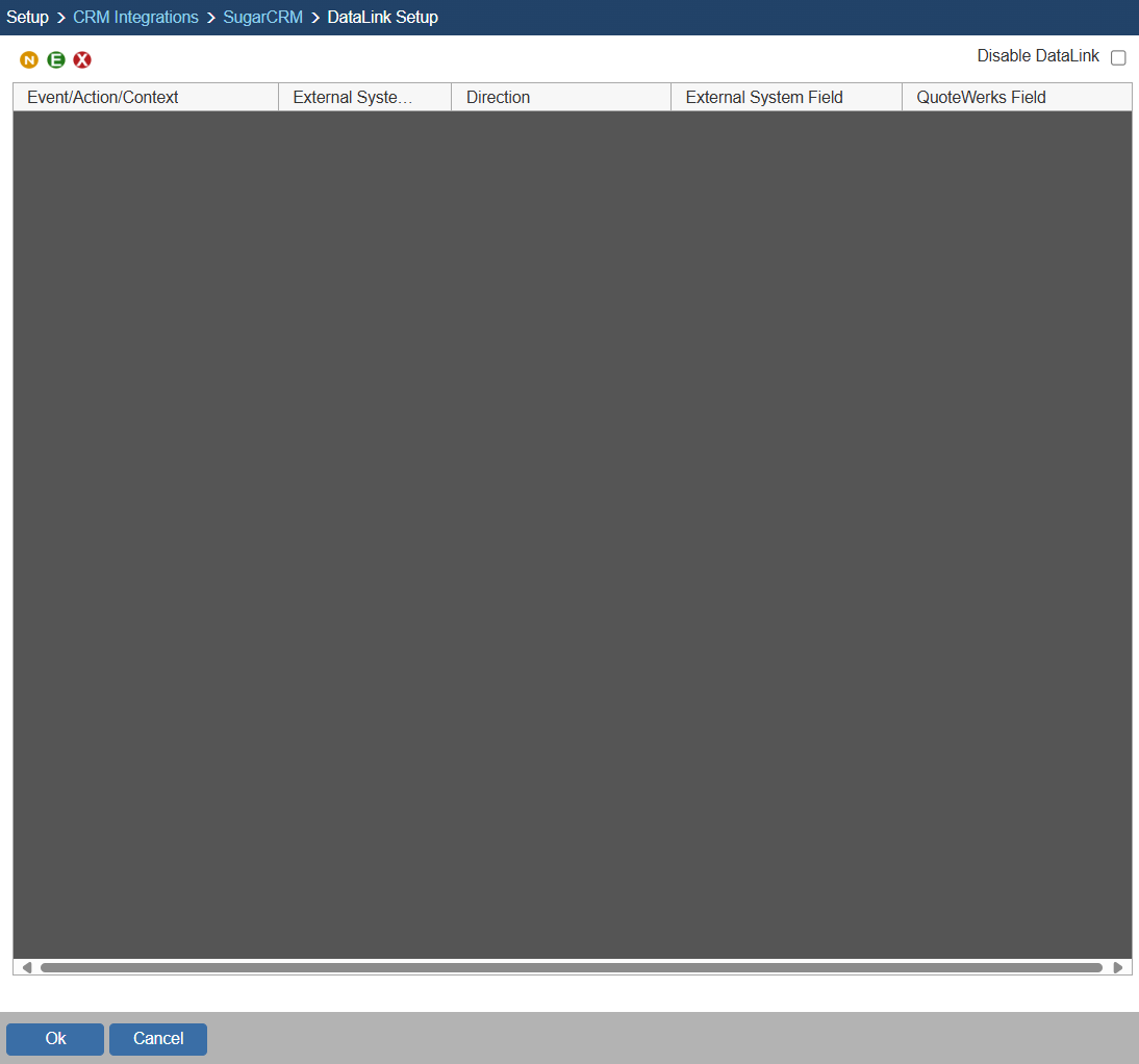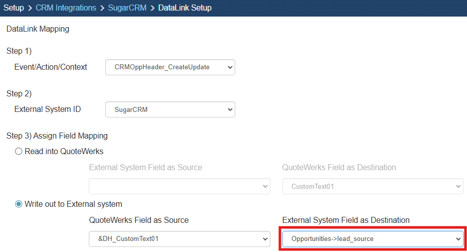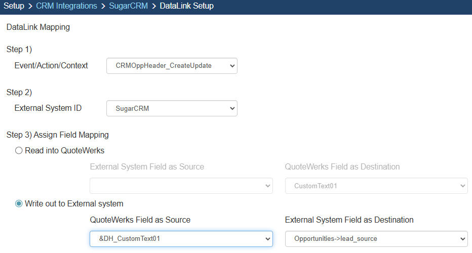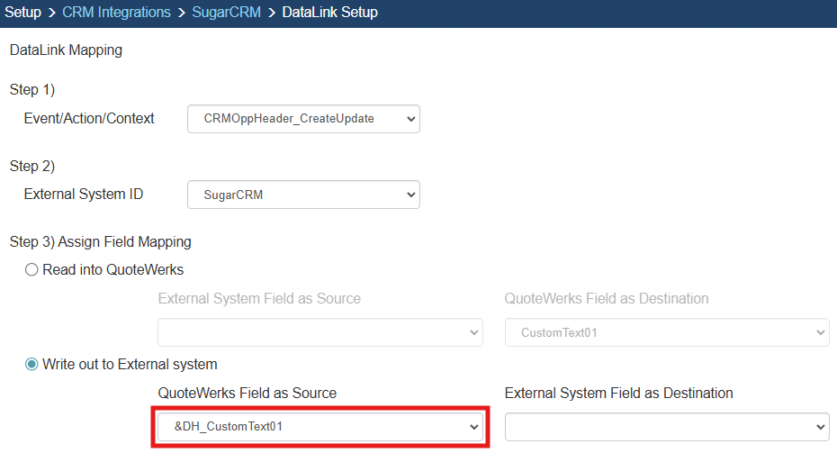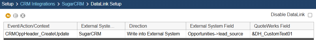 In the following example we are going to walk through how to push data from CustomText01 from QuoteWerks and have it populate a Field in SugarCRM.  You can push other fields through the DataLink mapping window.  You will need to create a new DataLink for each field you would like to populate however.