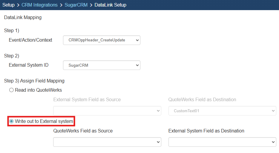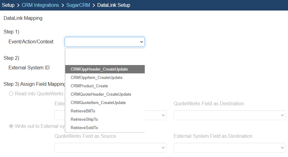 Step 2: On the next window (DataLink Mapping), change the first drop-down menu to CRMOppHeader_CreateUpdate to choose to push a DocumentHeader field from QuoteWerks to SugarCRM.   To push specific line item information, select CRMOppItem_CreateUpdate option. Your selection here will determine the table that QuoteWerks will use to push data into SugarCRM.