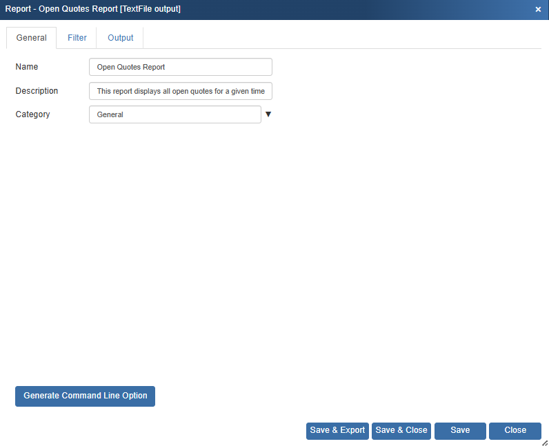 From the Management Reports window, click on the [New] button to create a new report, or click on the [Edit] button to edit an existing report. The report properties are displayed on three tabs; the General tab, Filter tab, and Layout tab.