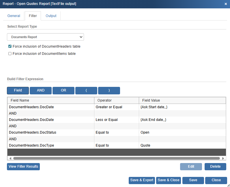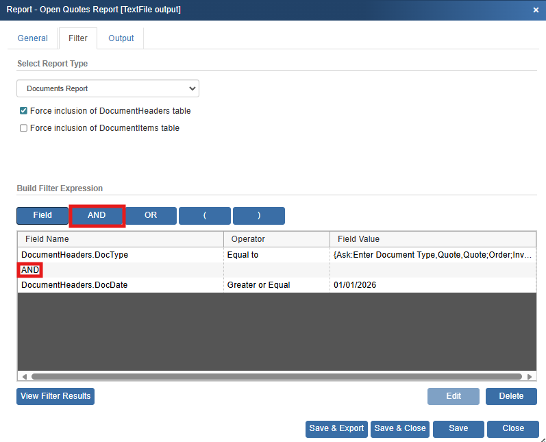 However, when you create multiple criteria filter expressions, you need to “connect” each criteria with a logical operator such as AND or OR. In our example we want to filter for DocType Equal to QUOTE and DocDate Greater or Equal to 01/01/2026, so before we add our second filter criteria of DocDate Greater or Equal to 01/01/2026, we need to select the [AND] button to add the AND operator after the existing DocType Equal to QUOTE filter: