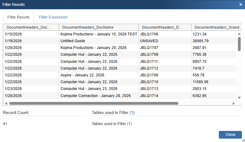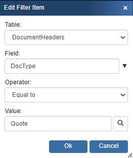 Lastly, click on the [Ok] button to complete the filter item selection. You will now see this filter item listed in the filter expression window. You have successfully created a simple, single criteria filter expression. “Single criteria” means that you are only filtering one field, though it is possible to filter on more than one field. Let’s say, for example, that in addition to a filter for a DocType Equal to QUOTE, you also wanted to filter for a DocDate Equal to 01/01/2026. The DocDate field is also in the DocumentHeaders table and is typically the date the document was created. We would add this filter exactly the same way that we added the filter for the DocType field.