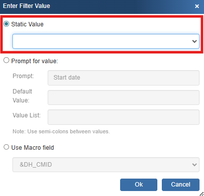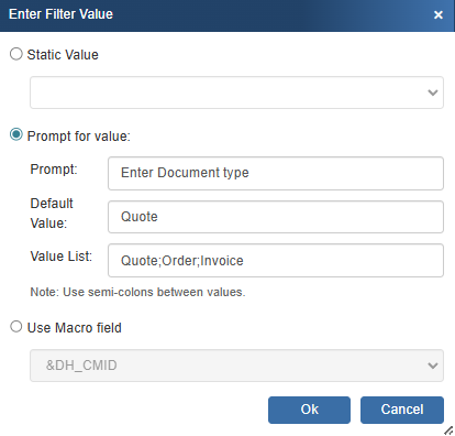 Using this option, you can enter a static value that will be the same every time the report is run. You can manually type in a value here, or you can click on the drop-down to see a list of all the values that are currently in the database for this field. Additionally, if this filter value is for the SalesRep field in the DocumentHeaders table, then the drop-down will also contain a list of all the User Groups. You can select a User Group like <Inside Sales> to filter on a group of users.