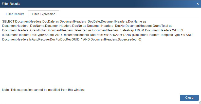 Clicking on the Filter Expression tab will display the SQL statement used to return the filter results. This is for viewing purposes only, and cannot be modified from this window: