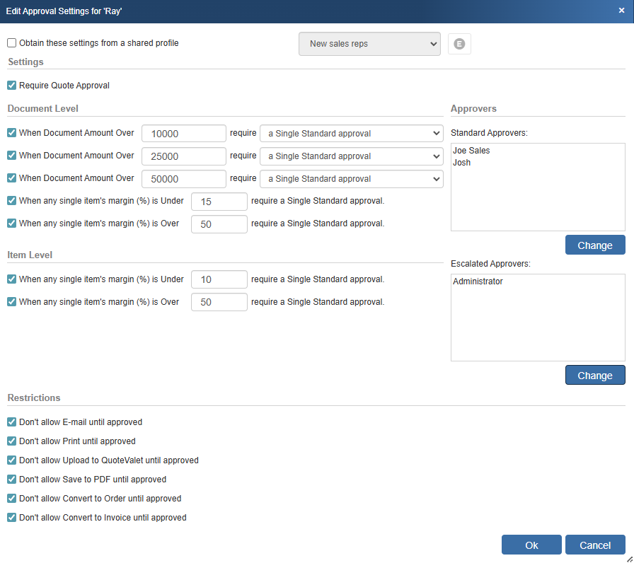 Document Approval can be setup for a single user or with for profiles that can be applied tomultiple users. The first is to create document approval settings for a single QuoteWerks user.