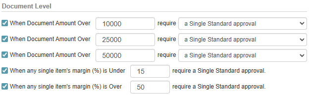The document level settings enables users to require authorization of the quote if the document is over a certain dollar amount and/or if the document is under or over a certain margin percentage.