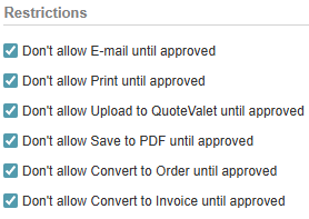 At the bottom of the window Administrators can select the appropriate restrictions for the approvals. There are six options which prohibit users from emailing, printing, or uploading to QuoteValet until the document has been approved: