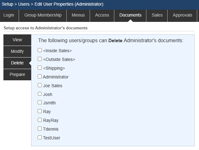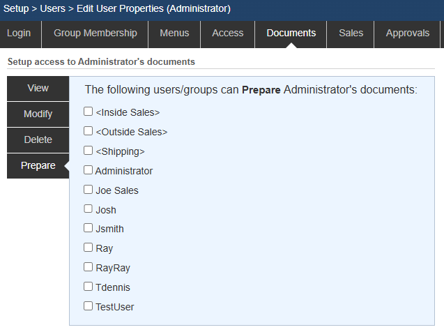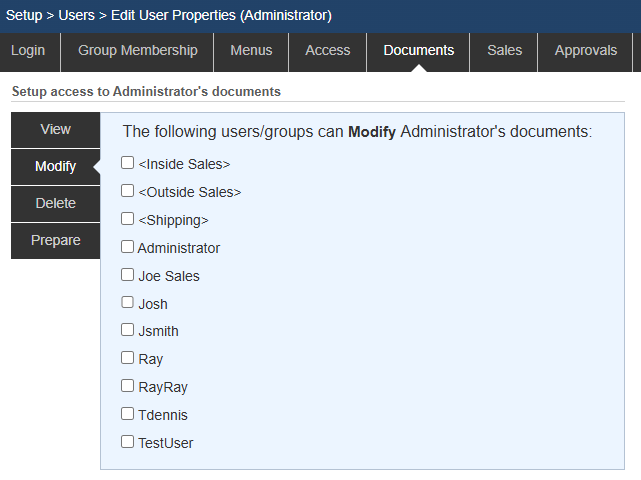 On the Documents tab, you can specify which users can view, modify, delete, or prepare quotes for this user’s documents. To toggle a user's access simply select or deselect the radio button next to the User or Group.