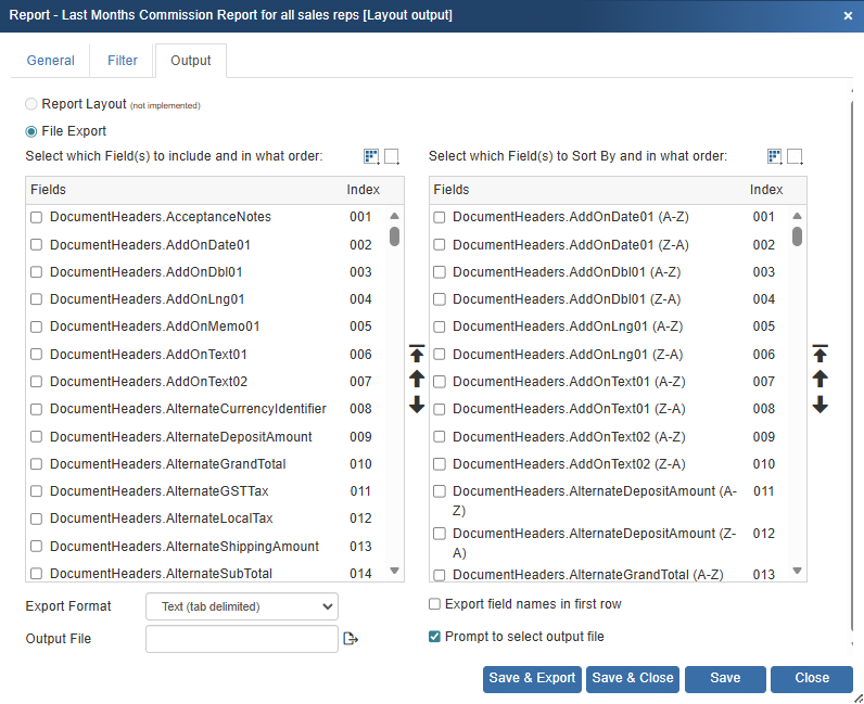 The Output File will display the default file name and location of the export file. If this is not changed, when this report is exported this is the name of the file that will be exported. If the report has not yet been exported, it will be blank and you will be prompted to set a file name and location.