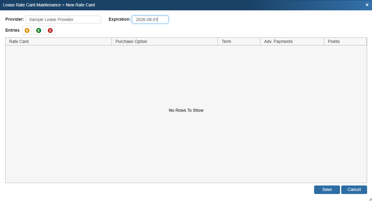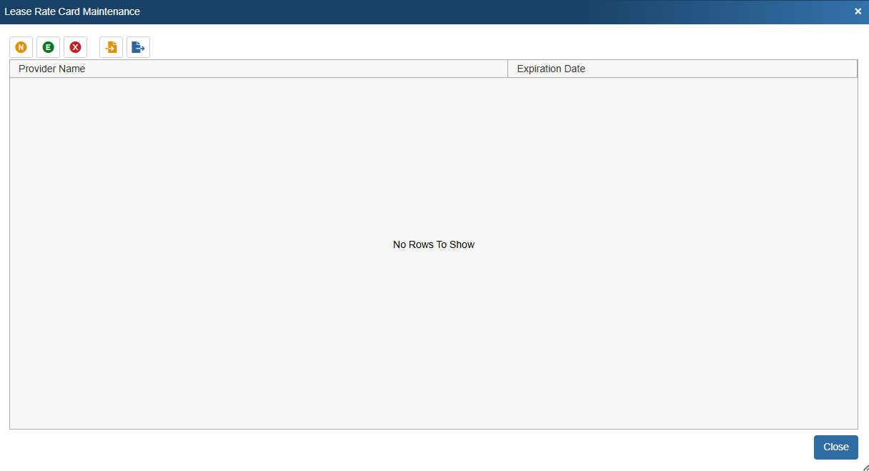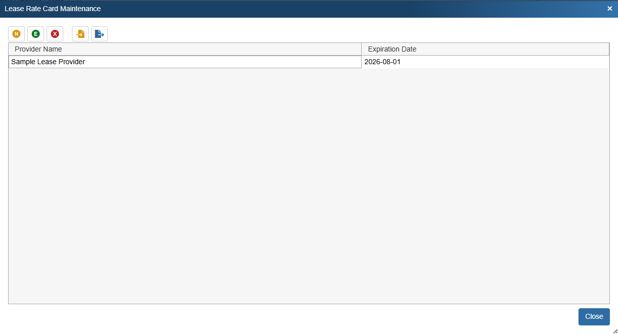 To create a new lease rate card navigate to Setup -> Options -> Lease Rate Card Maintenance. This opens the Lease Rate Card Maintenance window. Note that there are two file buttons at the top of the window that allow you import or export rate cards in XML format. For instructions on XML rate cards see the Leasing help file.