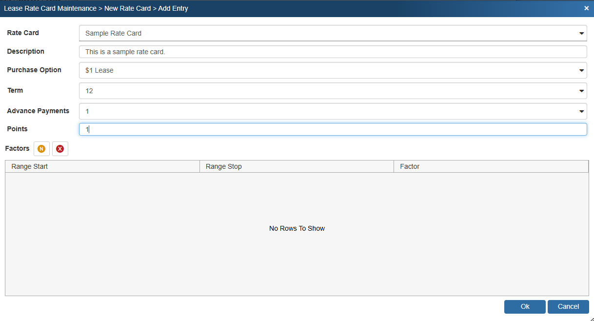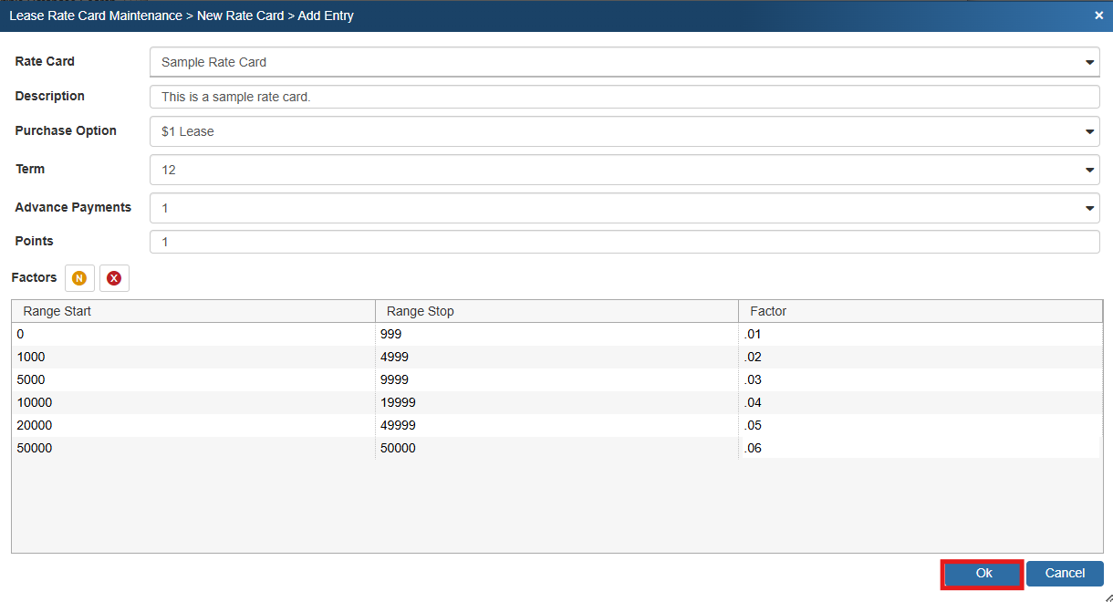 To use the newly setup rate cards, view the Lease Payment Options section of this manual.