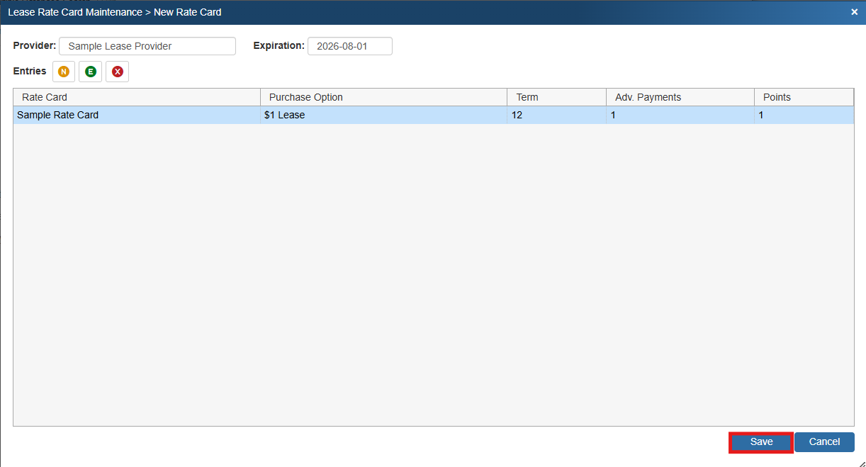 7. The new provider will now be listed on he Lease Rate Card Maintenance Window and will be selectable to include as a payment option to your customers.