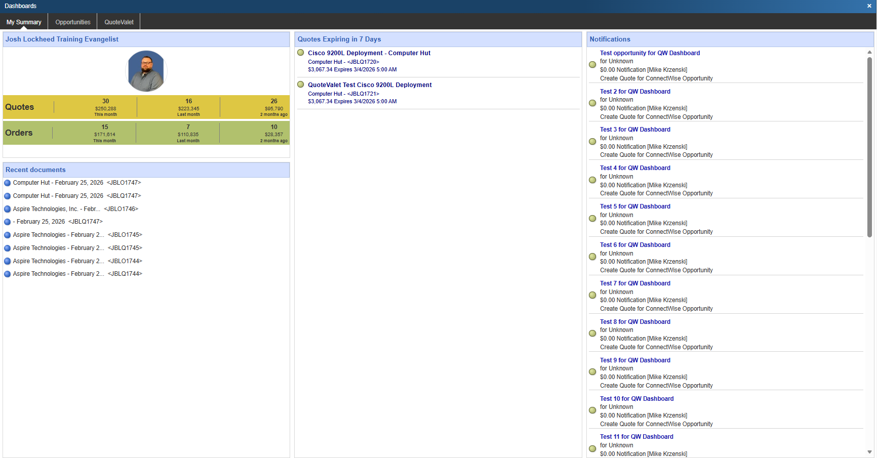 See QuoteWerks Dashboard Notifications for Autotask or QuoteWerks Dashboard Notifications for ConnectWise, depending on your CRM.