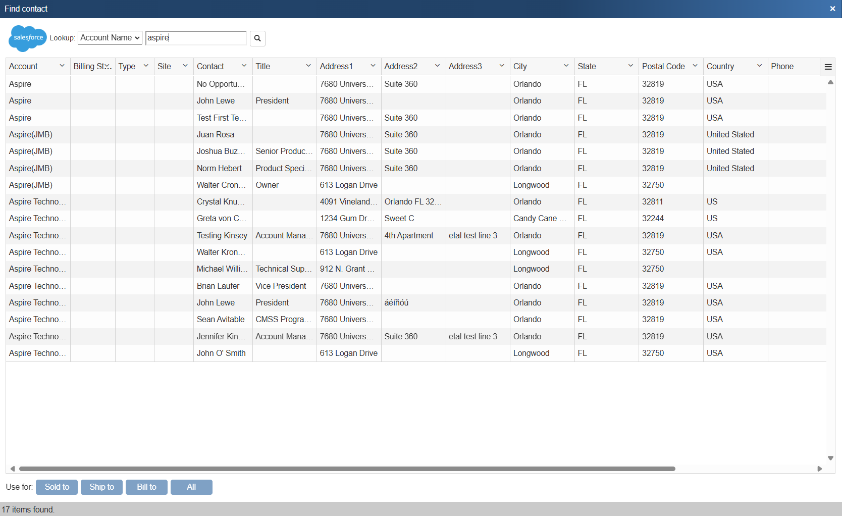 Once you have found the account or contact you are looking for, select the contact and click on the [Sold To] button to use this contact for the Sold to information. You can also select a contact and click on the [Ship To] button to use this contact for the Ship to information or you can click on the [Bill To] button to use this contact for the Bill to information. When you are finished selecting contacts, click on the [Close] button. You will be returned to the Sold to/ Ship to tab and the selected contacts will be pre-filled in the Sold to/Ship to/Bill to fields.