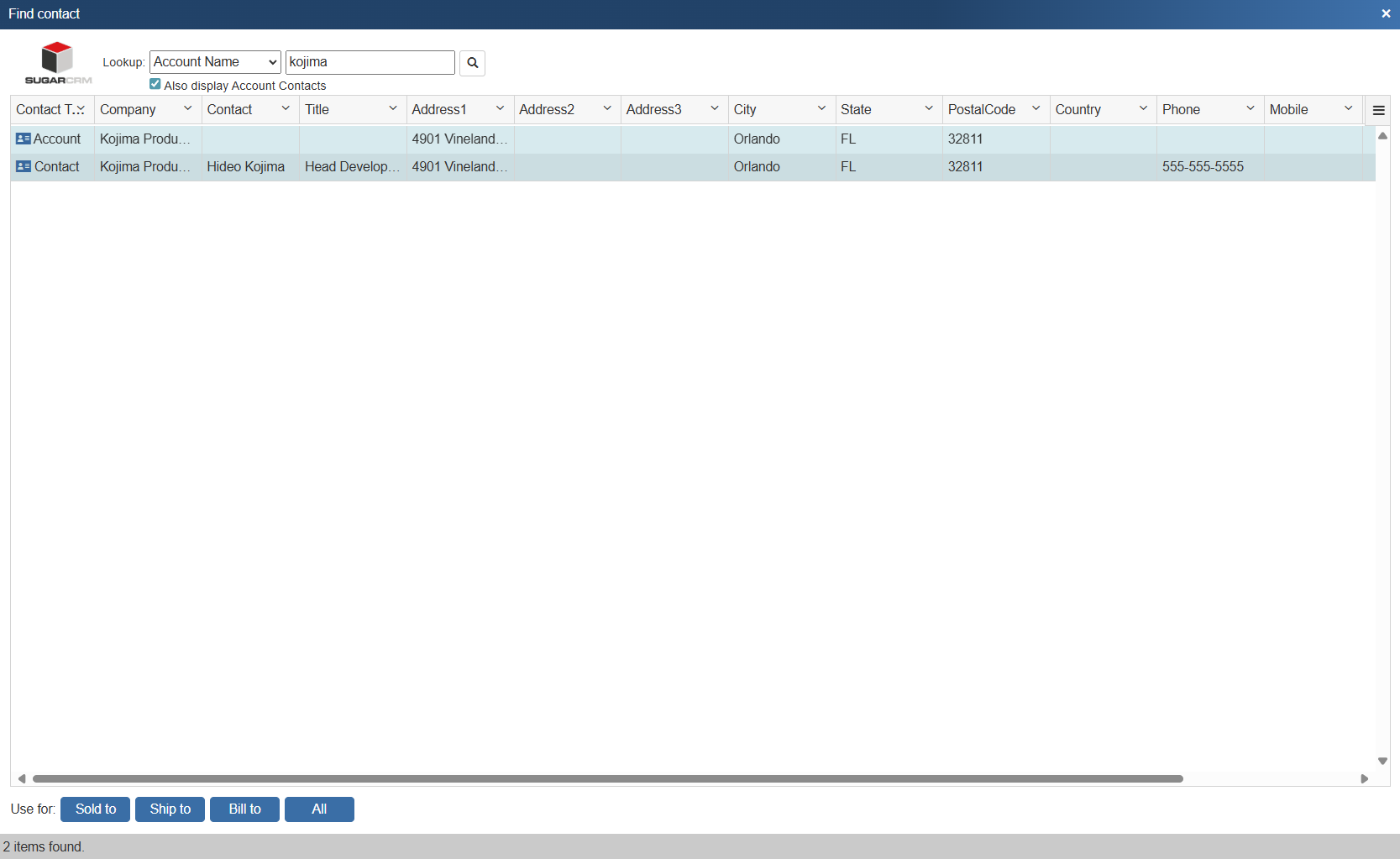 Once you have found the account or contact you are looking for, select the record and click on the [Sold To] button to use this record for the Sold to information. You can also select a record and click on the [Ship To] button to use this record for the Ship to information or you can click on the [Bill To] button to use this record for the Bill to information. When you are finished selecting records, click on the [Close] button. You will be returned to the Sold to/ Ship to tab and the selected records will be pre-filled in the Sold to/Ship to/Bill to fields.