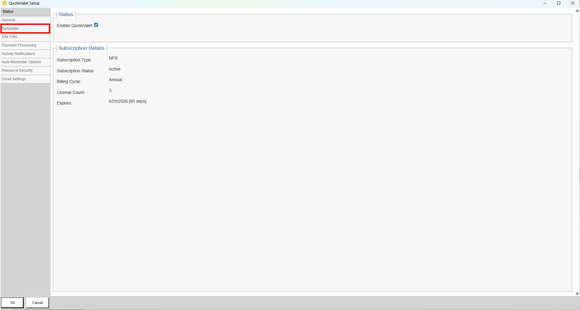 4.Once the QuoteValet Setup window has opened, navigate to the Templates tab.