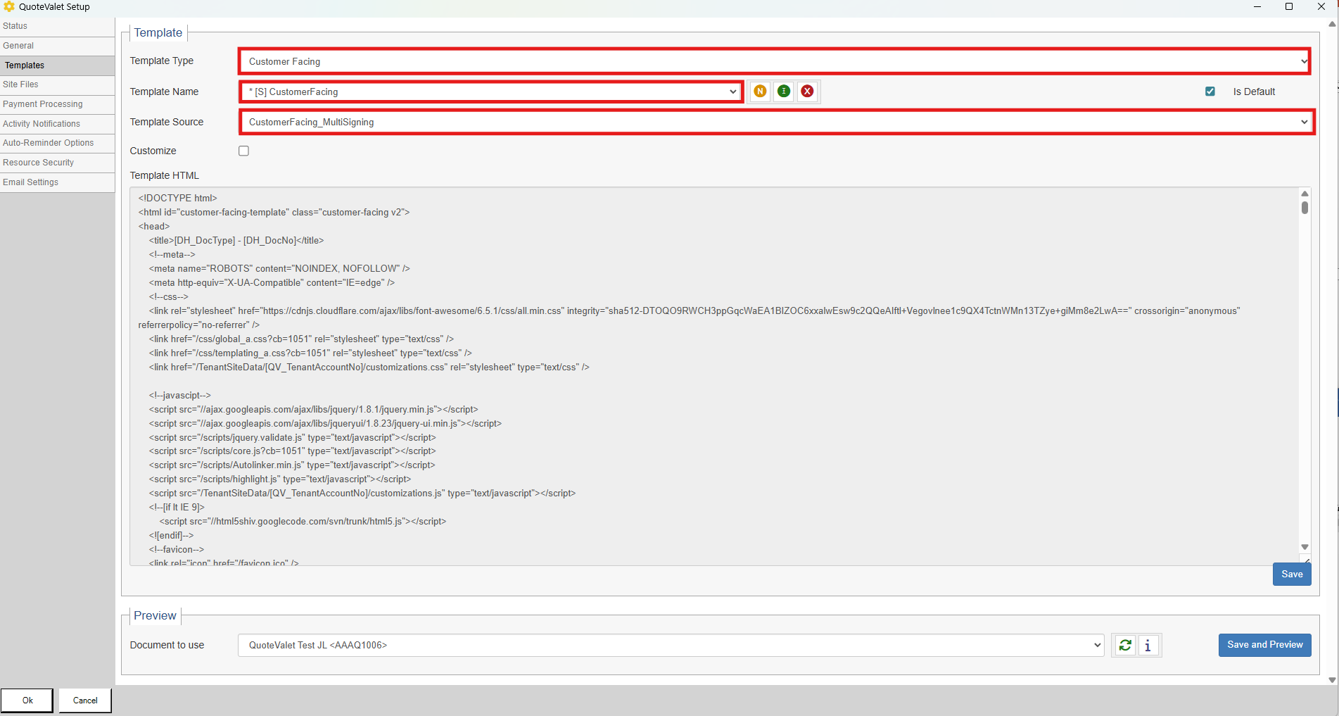 Navigate to Tools -> Options -> QuoteValet -> QuoteValet Setup -> Templates. The customer facing template must be set to Customer Facing -> *[S] Customer Facing -> CustomerFacing_MultiSigning as seen below.