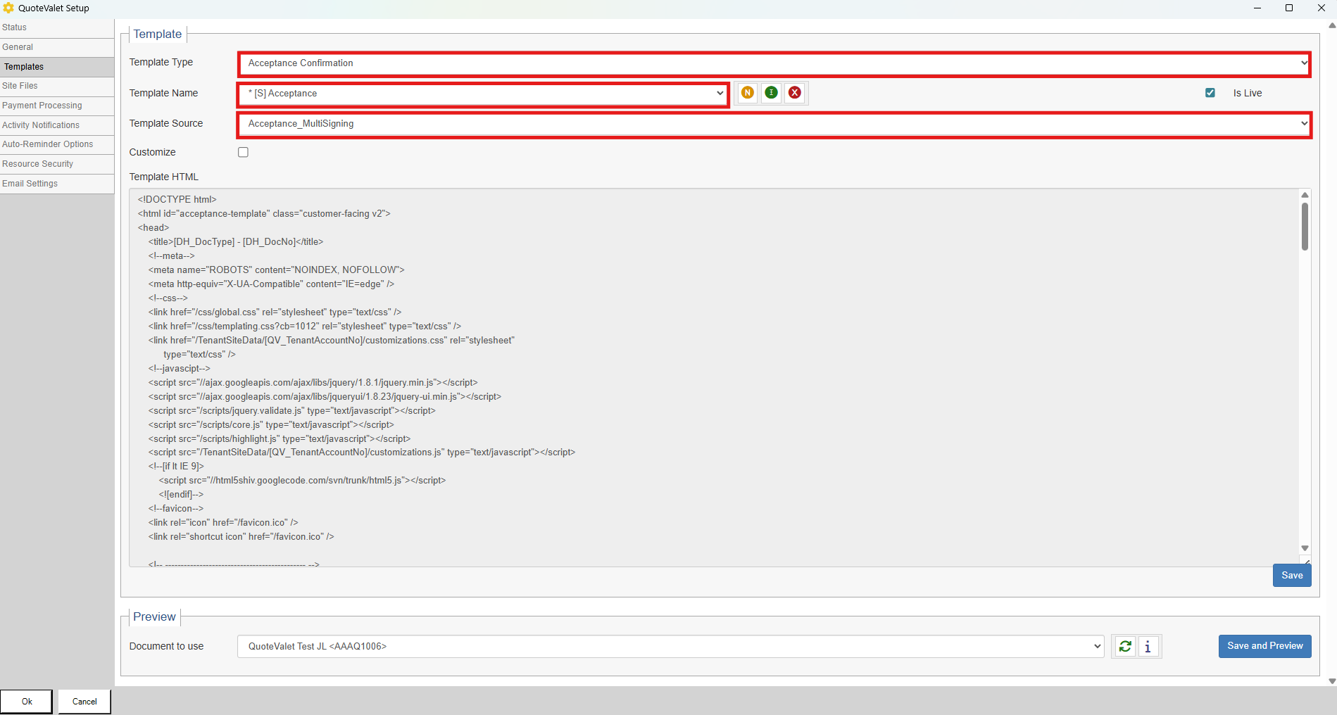 7.Select Template Type as "Acceptance Confirmation", Template as "*(S)Acceptance", and Use Public Standardized Template as “Acceptance_MultiSigning.” Make sure the "Is Live" button is selected to use this template.
