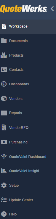QuoteWerks Web now provides the option to toggle on a new user interface. This new interface is more modern and creates a more intuitive user experience. It no longer features large icons across the top of the window. Instead, many of these options are available from the Left Navigation Panel, the Drop Down Menus, or the Grid Toolbar.