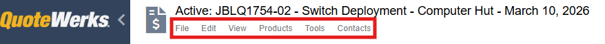 The dropdown menus across the top of the Quote Workbook are similar to those that you would see in most windows applications. They include File, Edit, View, Products, Tools, and Contacts.