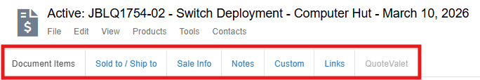 •File - The file menu contains different options that enable you to create new documents, open, close, and save existing documents, templates and revisions. This menu also gives you the ability to rename or delete the document, insert existing documents, or duplicate the document. It also has options to approve the quote if approval is required and convert the quote to an Order, Invoice or Lost Sale. There is also an option to open the Print/E-mail/Deliver document window as well as a menu to open recent documents you have interacted with.