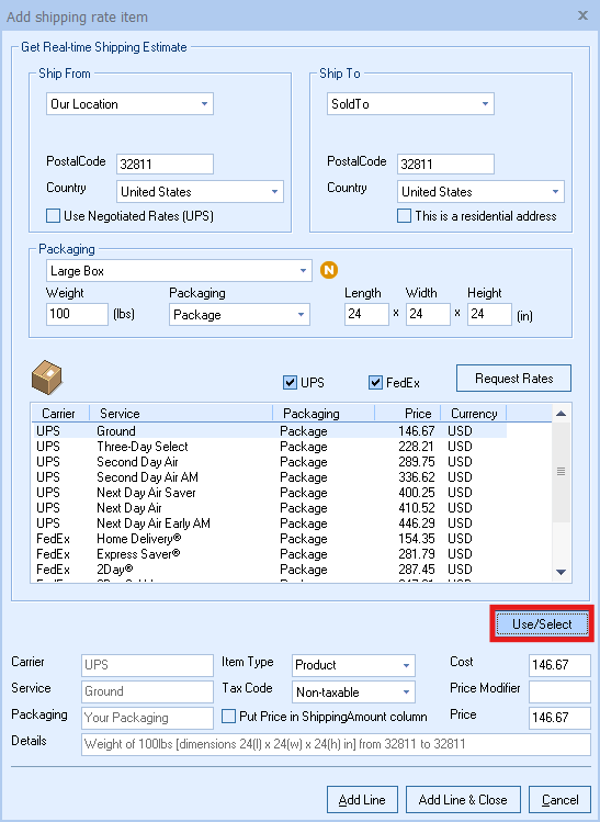 3. Select the shipping method you would like to use and click on Use/Select. This will populate the fields at the bottom of the window with your selections.