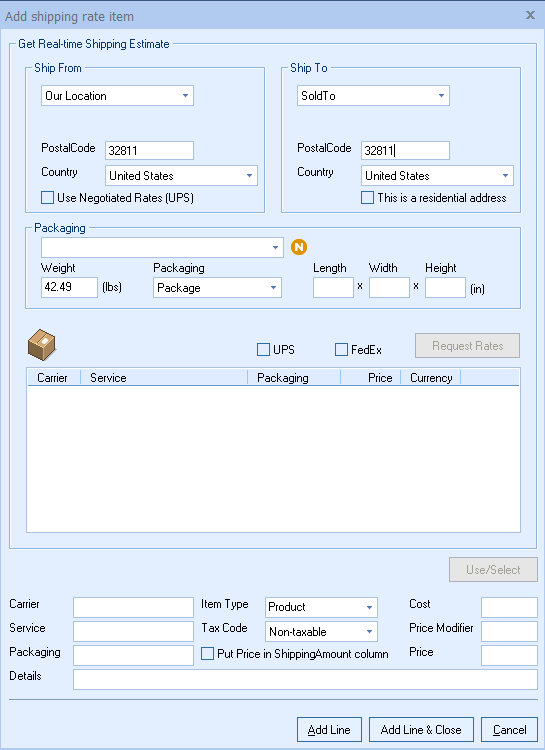 2. Enter your ship from and ship to information. This can be pulled in from the current quote or entered manually. Choose your packaging, weight, the dimensions of your package, which carriers you would like to get shipping rates from, and click Request Rates. A list of the available shipping options and associated costs will be displayed for each of the carriers selected.