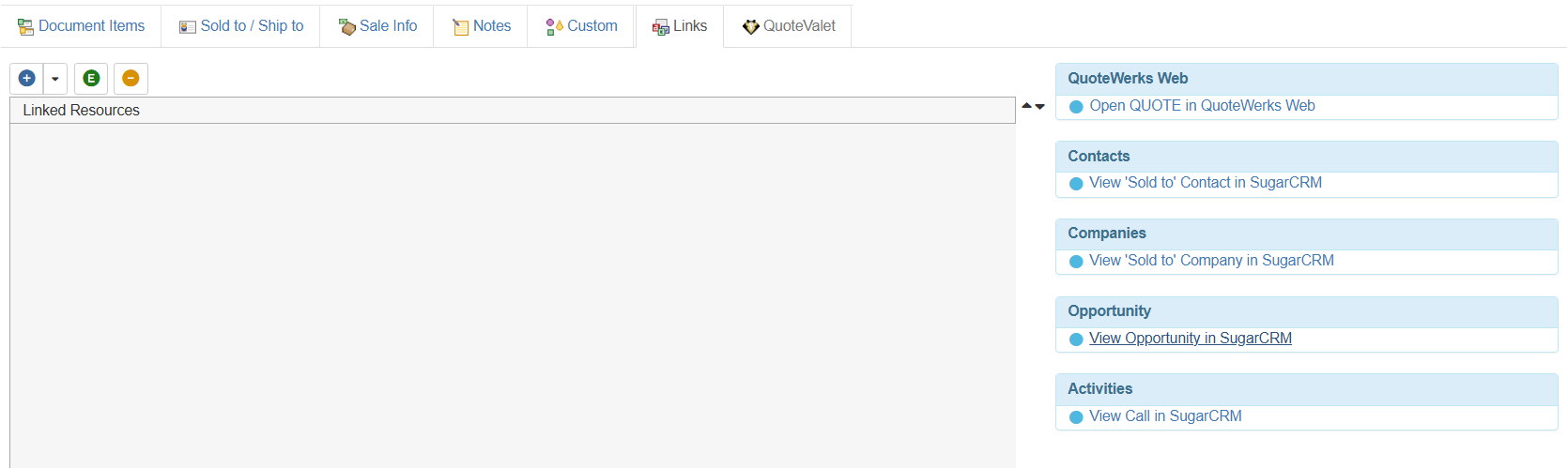 The Auto-Links window creates dynamically generated links from SugarCRM and links to specific details from the QuoteWerks quote.  These links are automatically created.
