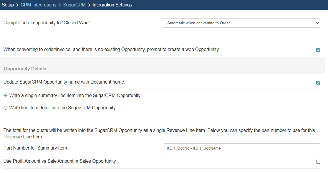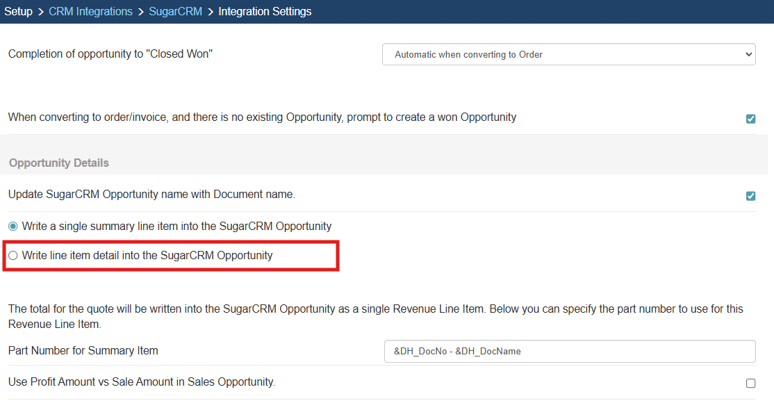 When QuoteWerks creates a sales opportunity in SugarCRM, this option lets you specify whether to write a single, summary line into the Opportunity or the individual line item details instead.