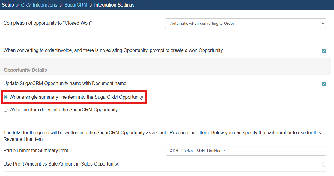 When this option is selected QuoteWerks will write a single summary line into the SugarCRM opportunity instead of the individual line items.