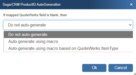 With this option, when exporting items to the SugarCRM Opportunity, instead of just using a simple field value like the ManufacturerPartNumber to become the SugarCRM Opportunity CRMProductID, you can choose to have the SugarCRM Opportunity CRMProductID auto-generated based on the item's ItemType.