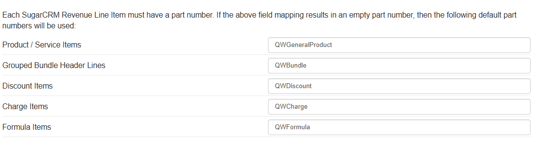 Each SugarCRM Revenue Line Item must have a part number. If the above field mapping results in an emptly partnumber, then the following default part numbers will be used: