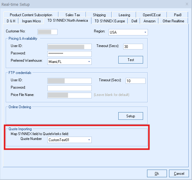 The TD SYNNEX North America Real-Time Pricing & Availability Setup works with both the USA and Canadian divisions of TD SYNNEX. Before you can setup and use the TD SYNNEX Real-Time Pricing & Availability features you need to obtain a real-time pricing and availability User ID and Password from TD SYNNEX. After you add these credentials to QuoteWerks, you will also have access to the TD SYNNEX Quote Importer on the Grid toolbar.