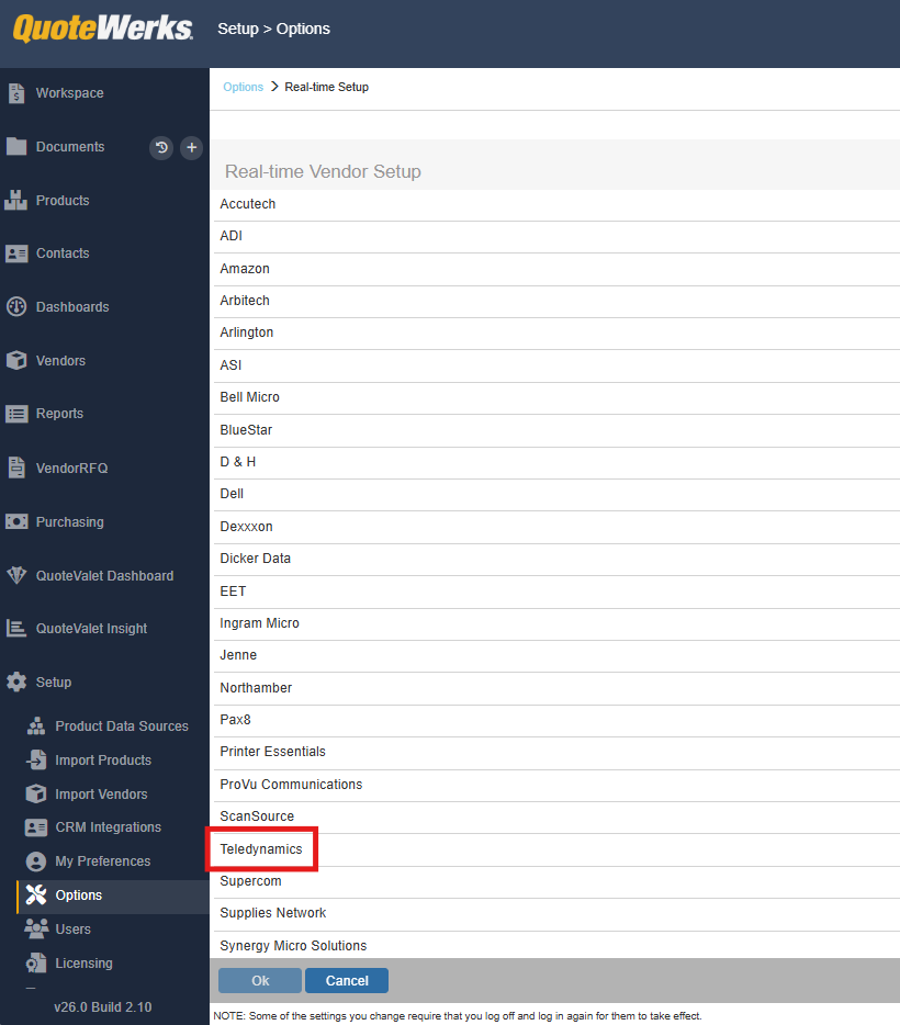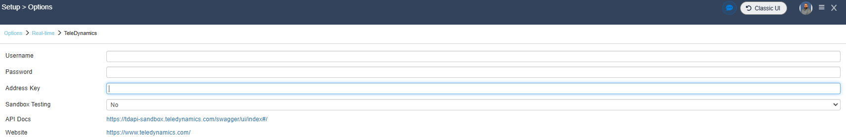 1. To setup TeleDynamics Real-time pricing and availability navigate to Setup > Options > Real-time and select TeleDynamics.