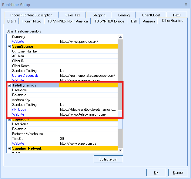 2. Input your TeleDynamics credentials, Address Key, select whether you are Sandbox Testing, and click [OK].