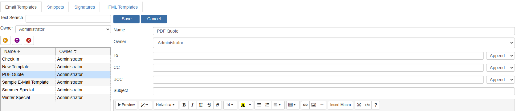 The To, CC, and BCC fields enable you to set default email addresses for specific templates. This is very useful if you want the sales manager BCC'd on every quote that goes out or maybe you need purchasing automatically CC'd when you are sending a payment request email. This feature makes it very easy to automatically default email addresses for specific email templates in your installation. You can also utilize macros in these fields.