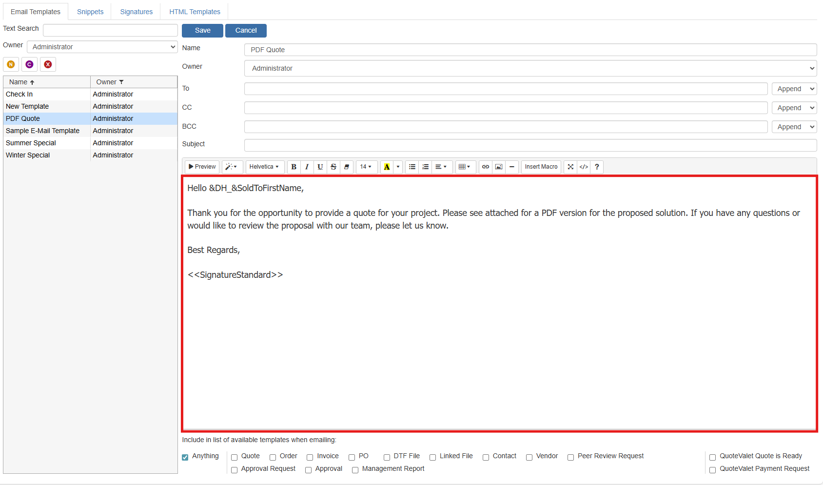 Checking this box will enable this template to be selected when creating any type of email in QuoteWerks.
