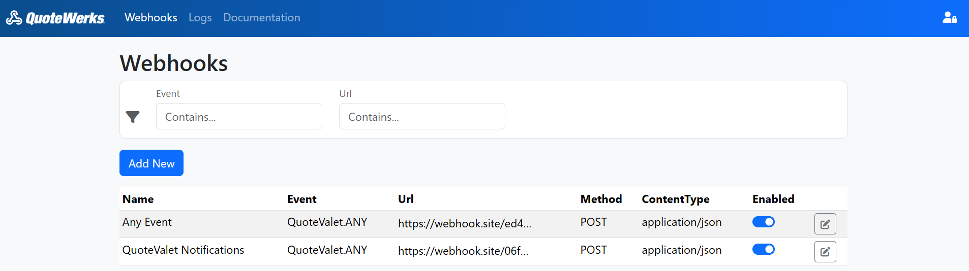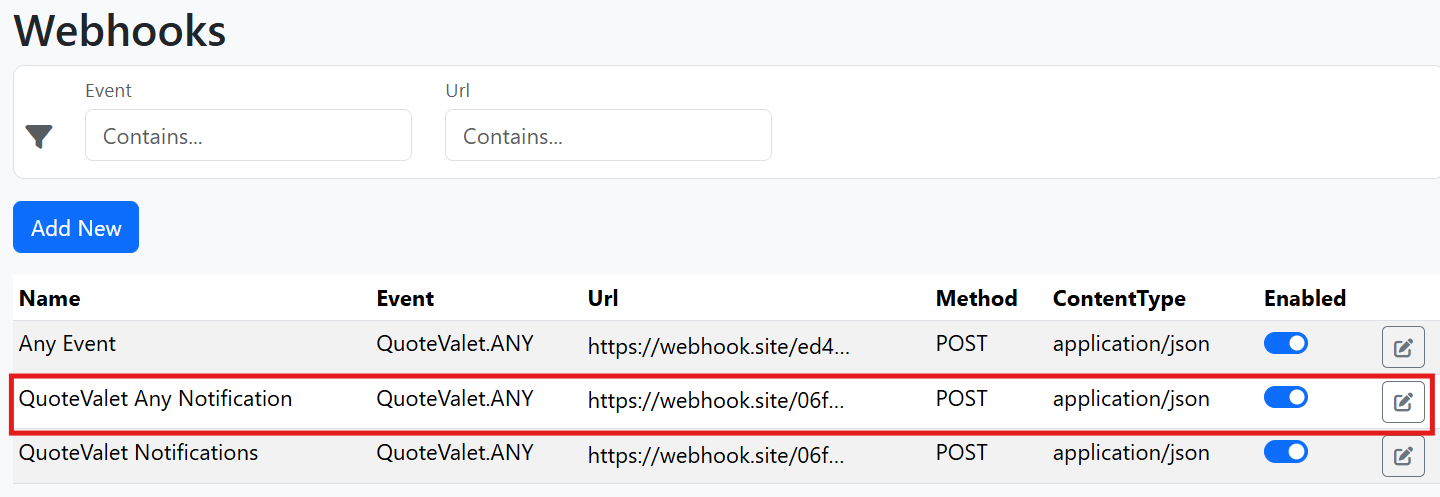 Note that on the page pictured above you can enable/disable a webhook by using the toggle button and edit the webhook by clicking on the pencil icon.