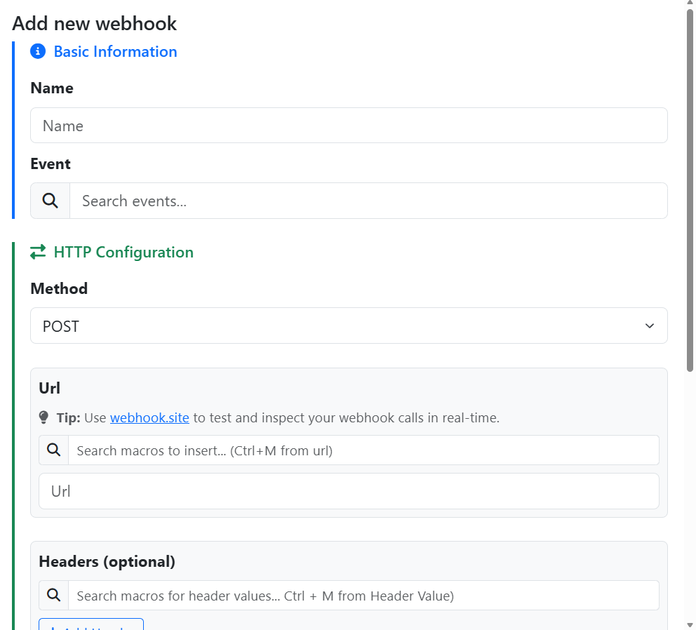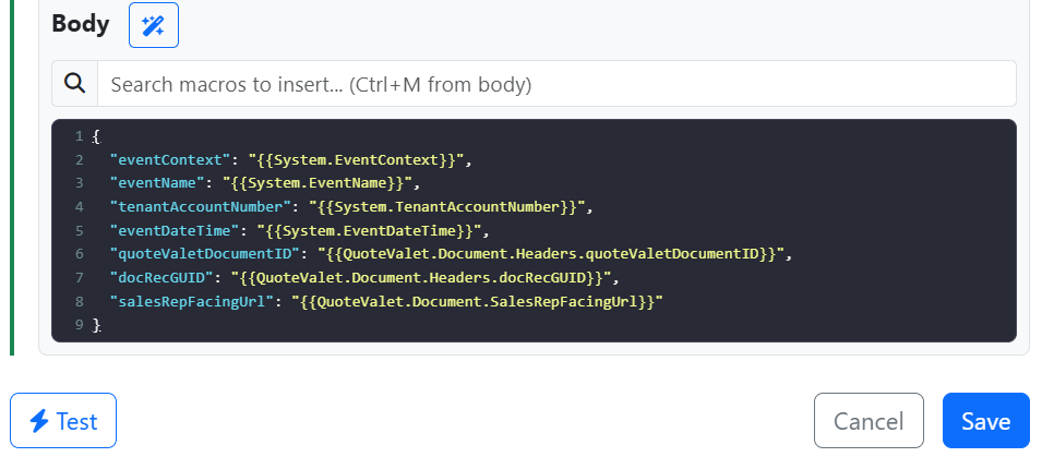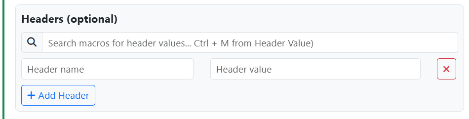 9. You can add optional header(s) to your webhook by clicking the Add Header button. Here you can give the header a name and a value. You can use the macro search bar to insert macros from the QuoteWerks system into your header value text box. To do so click into the Header Value field then click on the text box next to the magnifying glass and selecting the macro you would like to use. Alternatively, while in the header value field you can hold CTRL and hit M to open the macro search.